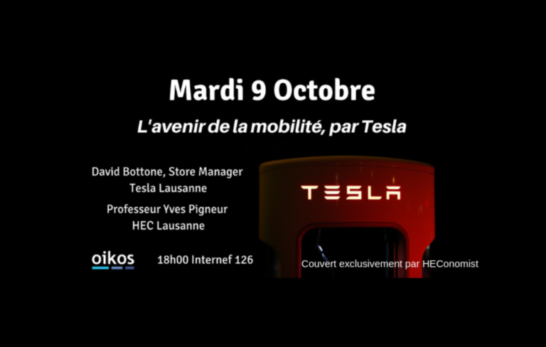 Oikos Lausanne, association HEC présente internationalement et qui promeut l’entreprenariat social, le développement durable et le management responsable, organise le mardi 9 octobre à 18h00 à l’Internef, salle 126, une conférence en partenariat avec Tesla et Yves Pigneur sur le thème de l’avenir de la mobilité.