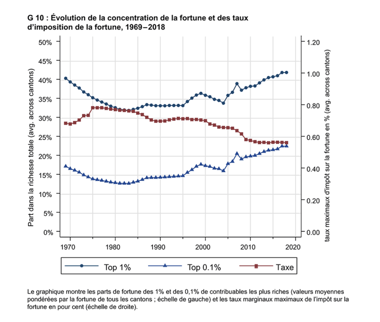 Si la concentration de la fortune en Suisse tend à augmenter, on constate une baisse de l’imposition pour arriver à une forme de stagnation depuis les années 2010 (graphique 2). Ainsi, le maintien de cet impôt ne signifie pas pour autant son immobilisme. Au contraire, le fédéralisme suisse a fait de l’impôt sur la fortune un champ d’expérimentation continue. Entre 1969 et 2018, les cantons ont modifié leur taux d’imposition plus de 500 fois, avec une tendance globale à la baisse, mais avec des variations cantonales considérables. Cette mécanique décentralisée crée une concurrence fiscale intercantonale dont les effets sont documentés et préoccupants.